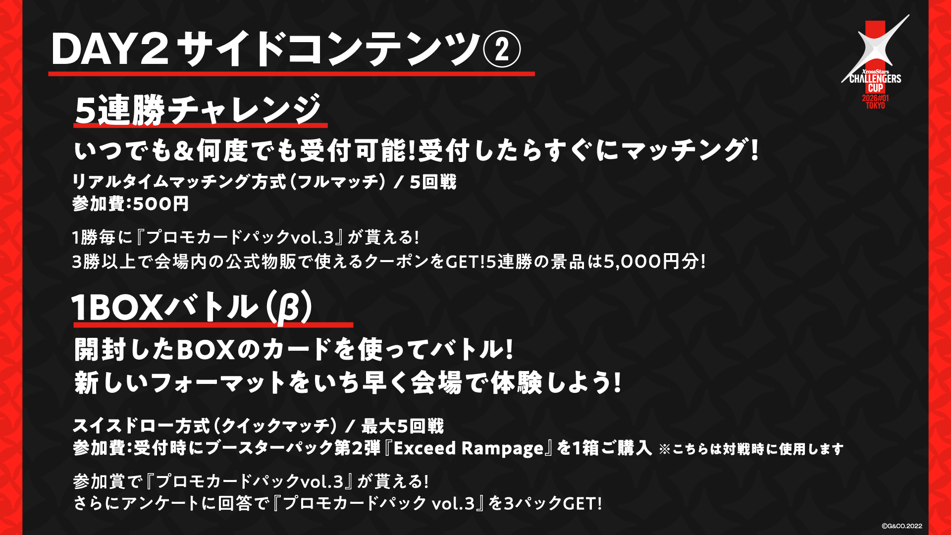 参加者はブースターパック第2弾『Exceed Rampage』環境における最強プレイヤーの座を争い、2日間かけて最大18回戦を戦います。