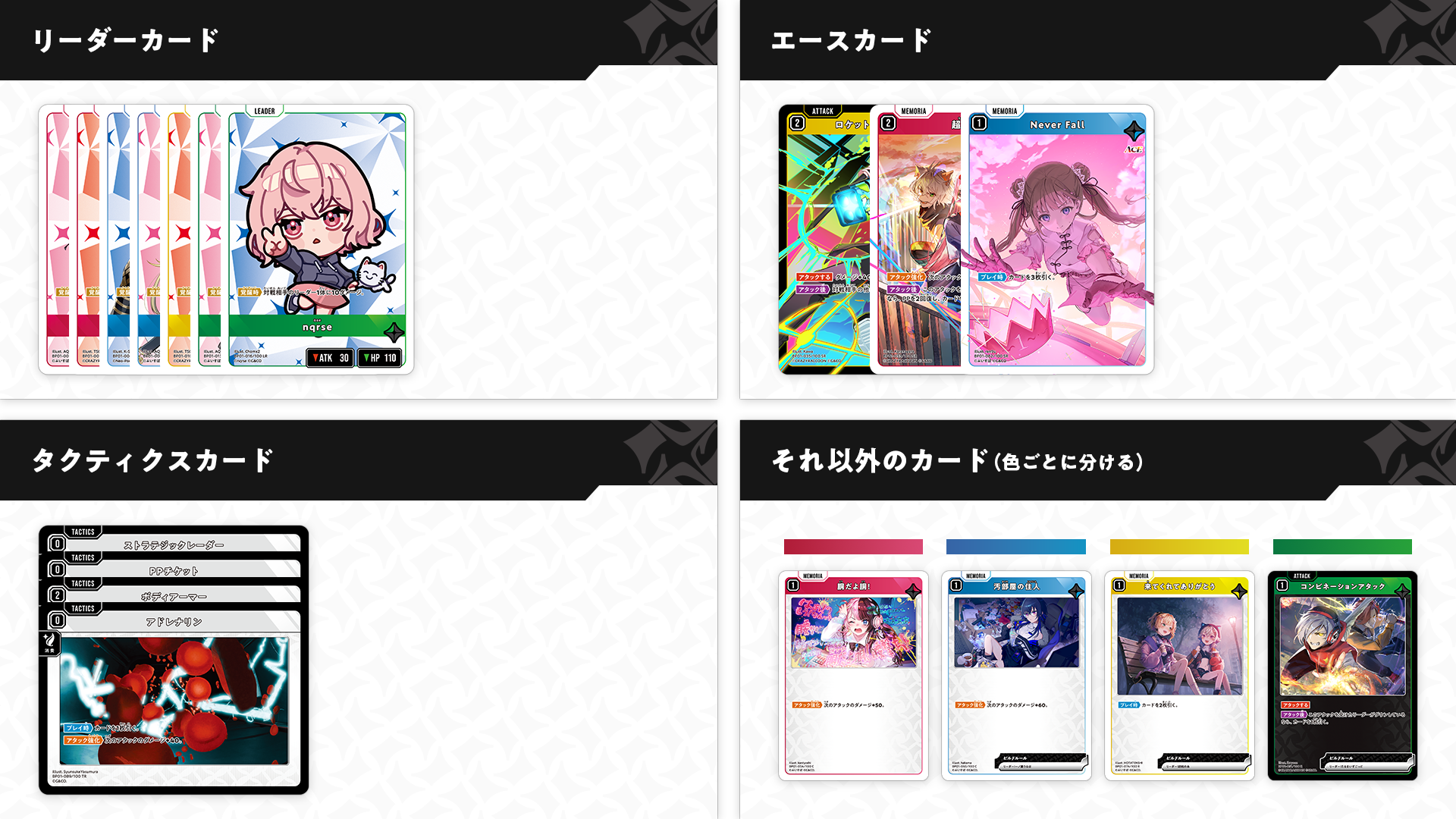 ・デッキに入れるエースカードの色がすべて含まれるように、リーダーカードを4枚選びます。リーダー専用カードのカードテキストや、枚数を見ながら選びます。